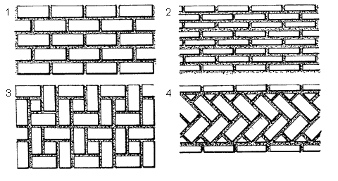 Рис. 34. Виды мощения дорожек из кирпича: 1 – обычной кладкой плашмя; 2 – обычной кладкой на ребро; 3 – попеременными рядами; 4 – «елочкой с бордюром»