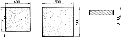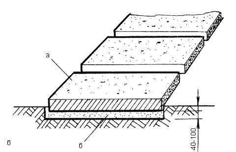 Рис. 35. Укладка бетонных плит: 1 – варианты размеров плит заводского изготовления; 2 – профиль дорожки из бетонных плит с небольшим промежутком: а – песок слоем 10–12 мм; б – бетонная плита