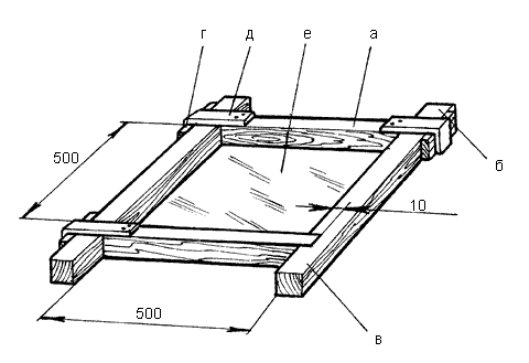 Рис. 36. Деревянная опалубка для изготовления бетонных плит: а – поперечный брусок 50 х 50 мм; в – паз для фиксации брусков; г – клин; д – скоба; е – основание из листового железа