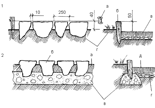 Рис. 44. 1 – бордюр из плоского природного камня, установленного по шнуру: а – шнур; б – камень; в – площадка; г – грунт; 2 – бордюр из плоского природного камня на бетонном основании: а – грунт; б – камень; г —насыпной грунт; д – площадка