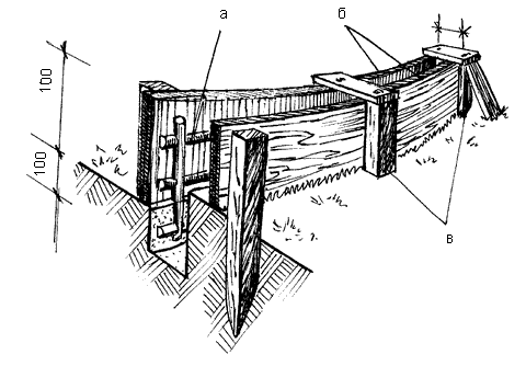 Рис. 45. Устройство опалубки для бордюра из монолитного бетона: а – арматура; б – обшивка из фанеры, толстого листового железа или оргалита; в – колышки