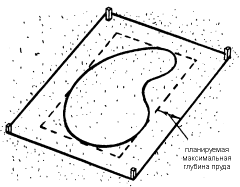 Строительство пруда с гибкой гидроизоляцией следует начинать весной в ясную погоду. Для этого сначала пометьте границы пруда и на земле обозначьте его контуры (рис. 62). Затем выкапывайте котлован на глубину примерно 30 см. По его краям оставьте немного земли для высаживания прибрежных растений (рис. 63).
