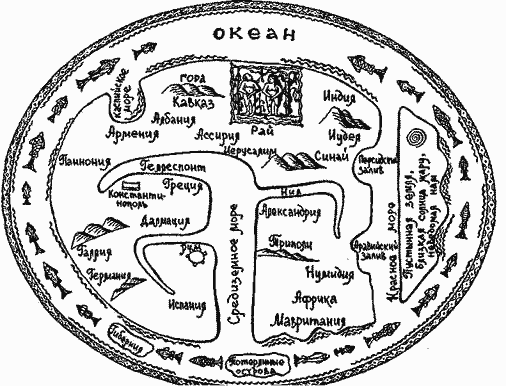 — Восток тут сверху, разумеется, где находится «Азия». На самом краю Востока, там, откуда восходит солнце, обретается Земной Рай. Слева от Земного Рая гора Кавказ. Рядом Каспийское море. Теперь смотрите внимательно. Индий существует три. Великая Индия, где очень жарко, находится она справа от Земного Рая, Северная Индия, за Каспийским морем, то есть тут у нас в верхней части слева… Там студено, так студено, что вода превращается в стекло. Именно там племена Гога и Магога были окружены по приказу Александра каменной стеной. Третья Индия — это Индия умеренная, приближенная к Африке. Африка на этой карте находится справа в нижней части, у полудня, где течет Нил, где открываются Арабский и Персидский заливы. Они открываются в Красное море, на другом бреге которого пустое место, близкое к самому солнцу экватора, и до того прогретое, что пойти туда не дерзает никто. К западу от Африки, в близости Мавритании, лежат Счастливые острова. Их другое имя — Потерянные. Потерянные острова были открыты много столетий назад одним святым. Он был моим земляком… Дальше, тоже внизу, но на севере, располагается та часть мира, где живем мы. Вот Константинополь на Геллеспонте. Греция. Рим. А это на самом далеком севере германцы и остров Гиберния.