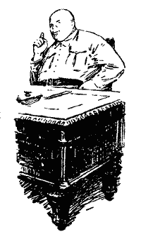 Масні губи, маленькі жваві карі очиці і сита усмішка надавали обличчю Сєрова такого виразу, ніби він щойно встав із-за багатого столу, але не від того, щоб знову повернутися до нього. Його квадратне тіло, потовщене на жирних грудях вигнутими накладними кишенями, лишалося в кріслі нерухомим, а голова вертілася на всі боки, як у тих ляльок, голови яких можна повернути задом наперед і навіть обернути кілька разів навколо осі.