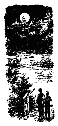 Мишко з Генкою пішли вперед. Вони обережно рухалися узліссям, весь час тримаючись лісу, щоб їх не було видно. Місяць світив з боку поляни, і тіні хлопців зливалися з тінями дерев.