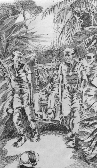 Зрозумівши, що остров'яни не збираються нести паланкін, американці взялися до справи самі. Кілька кремезних матросів, вийшовши з мотобота, підхопили паланкін і, наспівуючи, понесли його крутосхилом у резиденцію.