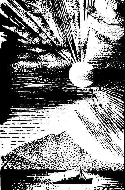 Тонкий, ледь помітний окраєць сонця виткнувся з моря, поширшав, перетворився на вогнисту кулю. Вона дедалі вище й вище піднімалася вгору, над безмежжям води та над кратером вулкана, — ніби велетенський валун, диявольською силою виштовхнутий з огнедишного жерла.