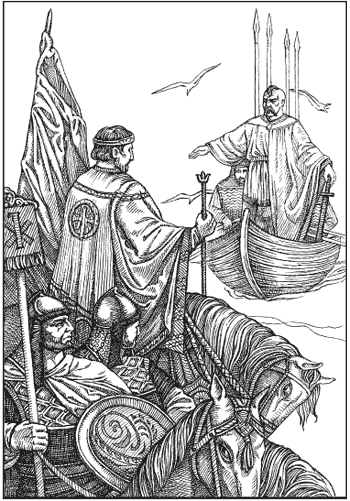 Супутники імператора Іоанна кинулись до берега, щоб дізнатись, хто посмів поставити човен тут, де присутній імператор ромеїв. Але одразу й зупинились… Гребці на човні виймали з кочетів весла, опустив кермо стерновий, усі вони вийшли на берег. Хтось із них підтягнув вище човен, а з гурту цих людей, що приїхали човном, вийшов чоловік, який тільки-но стояв позад гребців і керував човном.