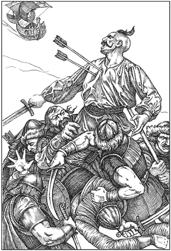 Під скелею лежав з глибокою раною на голові, все це бачив і плакав воїн Микула.