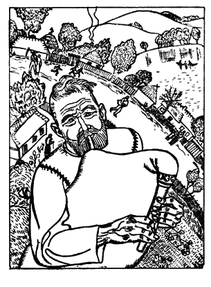І на яскраве сонечко вийшов найповажніший мешканець цього кубоподібного будинку. За спиною його пошепки величали «інтендант». Це перше іноземне слово, що я вивчив. На інтендантові теліпалася гімнастерка. На ногах роздувалися галіфе. Чобіт не було, натомість з-під галіфе визирали не вкриті засмагою білі ноги й кальсони, на ґудзиках, а не на шворочках, які ми бачили в поранених солдатів. Ті поранені виходили крізь дірку в паркані та стояли, простягши на долонях шматочки сірого мила. Міняли мило на хліб і тютюн. Стояли в сірих байкових халатах, із сіро-жовтими обличчями. З-попід халатів виднілися кальсони зі шворками-зав’язками.