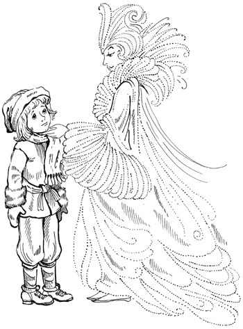 Королева посадила хлопчика поруч із собою й загорнула його у хутро. Він почувався так, ніби провалився у сніговий замет.
