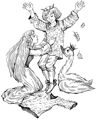 Коли кат узяв Елізу за руку, вона поспіхом накинула одинадцять сорочок на лебедів. Ті миттю перетворились на одинадцять вродливих принців. Але у наймолодшого лишилось лебедине крило замість руки – сестра не встигла закінчити останній рукав.
