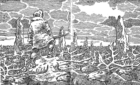 Ще якийсь час він до болю напружував очі — і нарешті побачив-таки те, чого сподівався. Далеко-далеко на півночі щось наче замерехтіло; так мерехтять на обрії хвилі спеки гарячого серпневого дня. Тепер у нього вже не залишилось сумніву. На півночі долини білий сніг раптом зник і весь небокрай наче зірвався з місця й почав насуватися на південь. Величезна хвиля оленів вливалася в долину, нагадуючи повільним, але невідворотним плином лаву, що вивергається з вулкана.