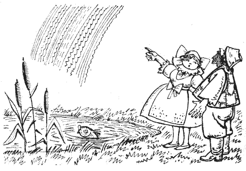 Та тільки на цьому їхня втіха й скінчилася. Веселка раптом одірвалася від криниці і знялася вгору. Та піднімалася вона повільно і час од часу спинялась.