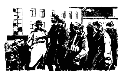 Колона проминула декілька вулиць. Есесівець знову опинився поблизу, і Миколка тепер навіть радів з цього: можна не відповідати. А батько весь час оглядався на нього, усміхався запаленими губами і, здавалося, став менше кульгати.