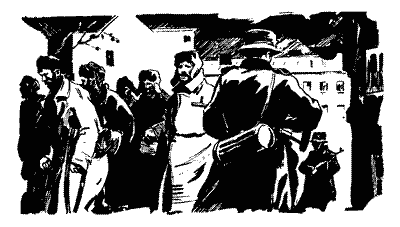 В цей час колона вийшла з провулка на безлюдну базарну площу. Всі ларки були наглухо забиті. Ліворуч, у дальньому кутку, біля критих навісів стояла невелика купка людей: там міняли одяг на шматок мила або пляшку згірклої олії.