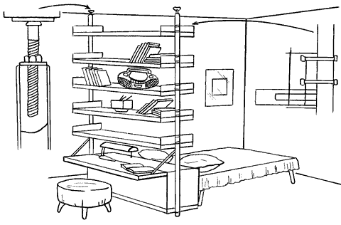Рис. 25. Стеллаж с изменяемой высотой полок, с откидным столиком, установленный у спинки кровати над ящиком для белья