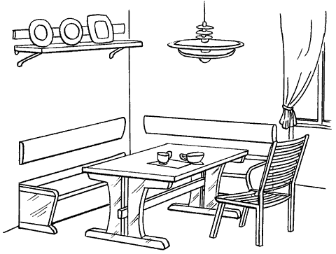 Рис. 27. Столовая мебель: лавки, встроенные в угол, с отсеками для кухонной утвари, полотенец и т. д.