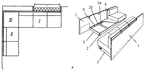 Рис. 38. Угловой диван: а — вид сверху и вразрезе; б — раскройка материала для трехместной части