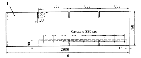 Наметьте на внутренней стороне продольной царги 2, а рамы 9 отверстий, положите раму на несколько опор и прикрепите к ней заднюю стенку несколькими струбцинами. Произведите сверление и пропустите болты через отверстия в задней стенке. На выступающие из цоколя части болтов наденьте шайбы и затяните их гайками.