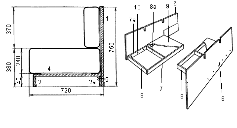 На рисунках 38, показаны общая конструкция, способ раскройки материала и порядок сборки деталей. Рама состоит из продольных передней (2) и задней (2, а) царг и из наружных (3) и внутренних (3, а) поперечных. Склейте между собой царги и дополнительно зафиксируйте их при помощи шурупов 3 х 60 мм, с потайными головками. Для верного соблюдения угла соединения можно использовать основание 4 (крышку) в роли соединительного элемента.
