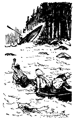 Зигмас ахнул и начал подталкивать вторую лодку. Люда не замечала ни Зигмаса, ни светлого льда, крошившегося под ногами. Всеми помыслами она была там, внизу, куда несло быстро уменьшавшуюся «ветку» Данилы. Зигмас усадил девушку спереди и налег на весла. Петя помогал ему доской. Зигмасу приходилось все время оборачиваться, он приходил в ярость, боясь потерять из глаз Данилу.