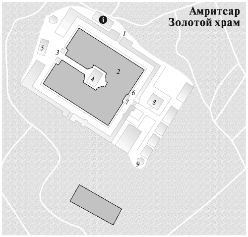 За входом в храм располагается мраморная набережная (Parikrama) Пруда амриты (Amrit Sarovar), имя которого носит город Амритсар.