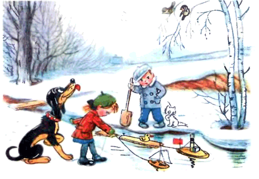 На одну баржу я посадил пластмассового утёнка. Маша сказала, что утёнок сам должен плавать, но я объяснил ей, что, во-первых, он дырявый и может утонуть и, во-вторых, он капитан каравана судов, и прочёл ей наизусть стихи Маршака: