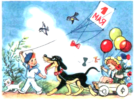 На улицах играла музыка, и по небу летели самолёты. Люди шли с цветами и красивыми плакатами. Везде пели и танцевали. Мы тоже подготовились к празднику: Ваня склеил большой змей и написал на нём: «1-е МАЯ».