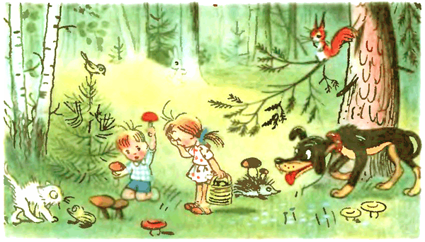 Скоро я собрала целую корзинку грибов. Усик в лесу познакомился с лягушкой: сначала испугался, потом — ничего, а лягушка сначала — ничего, потом испугалась и ускакала.