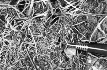 Ход в гнездо полевого шмеля. Внизу: карандашом указан ложный ход в гнездо малого земляного шмеля.