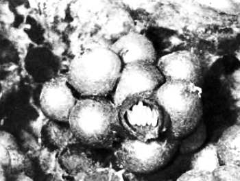 Бурый бугорок скоро превратится к пакет, который шмелиха засеет яичками. Внизу: шмелиные соты, стенка одного из пакетов вскрыта, видны стоящие в нем яички.