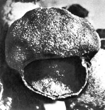 Шмелиные личинки. Внизу: пакет из восьми коконов — вид сверху и сбоку; хорошо заметно седлообразное углубление, образовавшееся под телом шмелихи-наседки. Темные валики по краям — основа ячеи второго яруса.