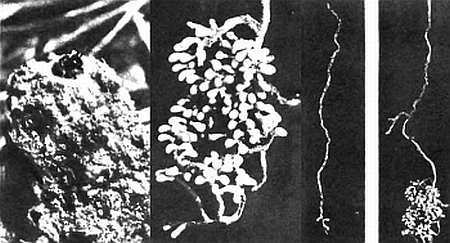 Выход из подземного гнезда проложен сквозь комочек грунта, выброшенного галиктами на-гора. (Фото слева.) Пчелы-галикты. По центру — гроздь ячеек пятилетнего гнезда. Справа — гнездо, сооруженное галиктой-основательницей к концу первого года, и такое же гнездо на пятый год. заснятого крупно. Чтоб сфотографировать скрытое в земле гнездо, надо предварительно залить его гипсом, дать застыть, потом осторожно отмыть грунт.