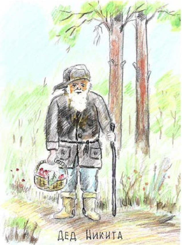 Ходили мы раз за брусникой. Надо было идти в дальний лес, а это довольно далеко. Занимает почти весь день. Берем с собой и корзиночки для грибов, и немного провизии. Пока дойдешь до брусничника по лесной дороге, обязательно наберешь полную корзинку молодых, крепеньких подосиновиков, как раз для жаровни. Двух, как говорится, зайцев убьешь. Так вот, набрали мы ягод, грибов и не спеша идем домой. Дорога – лесная просека; прямая, далеко впереди видно. Смотрим, впереди какой-то человек идет, но идет как-то странно: немного пройдет, присядет, опять идет. Нагнали мы его почти у самой деревни. Оказался им дед Никита. Ему 93 года. Ростом он метра полтора, если не меньше. Одна голова да борода чуть ли не до колен, как гриб-боровик из сказки. На ногах у него валенцы, благо сухо, на голове старый треух, пиджак подпоясан веревочкой. Пиджак ему до колен, рукава закатаны. Такой вот маленький дедок, похожий на гнома.