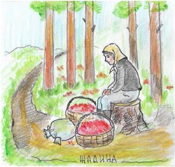 А дома, в деревне переполох. Муж пришел с работы, а жены нет. Где? Что случилось? Ходила за ягодами и не вернулась. Он с сыном в лес. А наша Люба сидит на дороге и горько плачет. Ягод бросить жалко и дальше нести их не может, нет сил. Жадина!