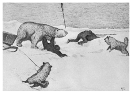 Вперед! Затем мы вышли на равнину. Двигаясь все быстрее и быстрее, мы неслись по лужам, так что только брызги летели во все стороны. Все ближе и ближе придвигалось темное водяное небо, оно подымалось выше, – ясно было, что мы приближаемся к открытой воде. Теперь не хотелось думать даже о медведях. А их, по-видимому, было тут немало: медвежьи следы, и старые и новые, расходились во все стороны. Один из медведей побывал возле палатки и заглядывал к нам, пока мы спали, – по свежим следам видно было, как он лавировал, чтобы подойти с подветренной стороны. Теперь нам не нужны медведи, пищи у нас достаточно.