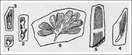 Самыми замечательными экземплярами всей коллекции являются листья небольшого Ginkgo, из которых один сохранился в целости (рис. 6). Этот род со сливообразными семенами и, в противоположность другим хвойным, с настоящими листьями представлен сейчас только одним видом в Японии, но в прежние эпохи насчитывал многочисленных представителей во многих местностях. В продолжение юрского периода он процветал главным образом в Восточной Сибири; его находили также на Шпицбергене, в Восточной Гренландии (у пролива Скоресби) и во многих местах в Европе. В меловом и третичном периодах он встречался на 70° на западном берегу Гренландии. Добытый ныне лист принадлежит к виду, который мог бы быть назван Ginkgo polaris и является весьма родственным Ginkgo flabellata (Heer) из юрских отложений Сибири. Он несколько сходен с Ginkgo digitata (Lindl. et Hutton), в особенности с экземплярами, найденными в бурой юре Англии и Шпицбергена. Кроме этого вида, в коллекции находятся, по всей вероятности, еще один или два других, а также части листьев принадлежащего к семейству Ginkgo рода Czekanowskia, листья которого узки и похожи на хвою.