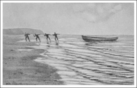 «Пятница, 18 августа. Шторм продолжается. Держим курс на юго-восток. В 7 ч 30 мин утра Свердруп увидел к югу от нас землю, он находился в это время наверху в бочке, высматривая медведей и моржей на льдинах. В 10 ч утра я сам поднялся наверх, чтобы тоже взглянуть на эту землю. Она лежала от нас в расстоянии немногим больше 10 морских миль. Это низменная земля, по-видимому, такого же характера, что и