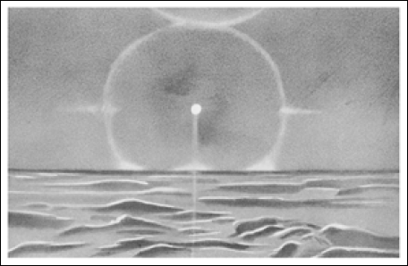Вечером Скотт-Хансен, вернувшись с палубы, сообщил, что наверху невиданное северное сияние. Световые блики играли повсюду на снежном покрове, а на палубе было совершенно светло. Небо пламенело, особенно на юге, где огненная масса взрывалась и высоко полыхала вверху. Попозже Скотт-Хансен прибежал снова с вестью, что теперь это зрелище прямо бесподобно.