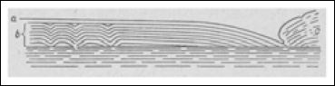 Вид слоев приблизительно такой, как показан на чертеже. Странно видеть, что льдина, мощностью более чем в 3 м, изогнулась большими волнами, но не взломалась. Это, очевидно, произошло от давления и особенно ясно заметно вблизи торосов, которые придавили льдину своей тяжестью так, что поверхность ее местами оказалась на одном уровне с поверхностью воды; в других местах льдина выдалась из воды на полметра или даже больше; здесь ее выпирает кверху поджатый снизу лед.
