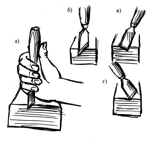 Рис. 28. Работа со стамеской при резании выемок поперек волокон: а – исходное положение стамески; б – положение лезвия стамески в начале вертикального надреза; в, г – положение лезвия стамески в конце вертикального надреза
