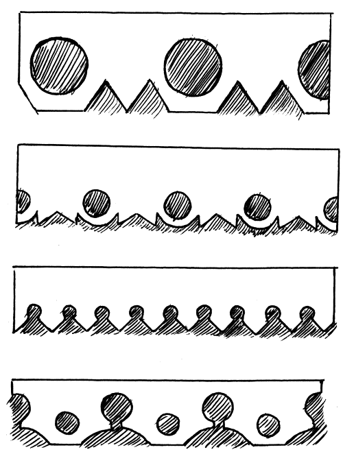 Лунки можно резать по-разному, получая различную форму рельефа. Рассмотрим три варианта резьбы лунок.