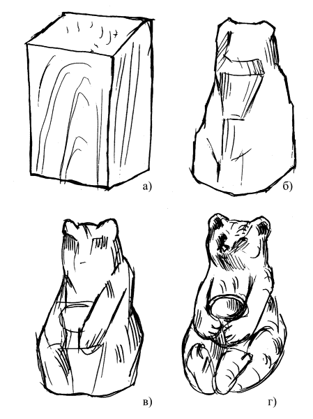 Рис. 47. Последовательность резьбы медведя: а – разметка; б – зарубка; в – черновая обработка; г – чистовая обработка и выжигание узора штампиками