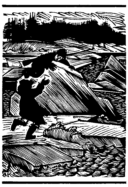 Отдышавшись, оглядев реку, они видят, что им угрожало. Где они только что были, задерживаясь на отмели, громоздясь друг на друга, льдины творят страшный танец. Горы сверкающего льда поднимаются со дна реки, растут, возносятся к небу. Сверкающие ледяные фонтаны бьют из белого поля, тают, исчезают и вновь их серебряные струи дрожат в синем небе.