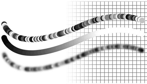 При распылении линия теряет «плотность», поскольку мазки больше не образуют непрерывной линии. Ползунок Count (Количество) позволяет увеличивать число мазков в некоторое количество раз – благодаря этому они плотнее заполняют линию. С помощью ползунка Count Jitter (Случайное изменение количества) можно изменять количество мазков случайным образом – благодаря этому линия будет в некоторых местах плотнее, а в некоторых – разреженнее. Наконец, используя раскрывающийся список Control (Управление), можно осмысленно управлять изменением количества мазков все по тем же хорошо известным нам принципам.