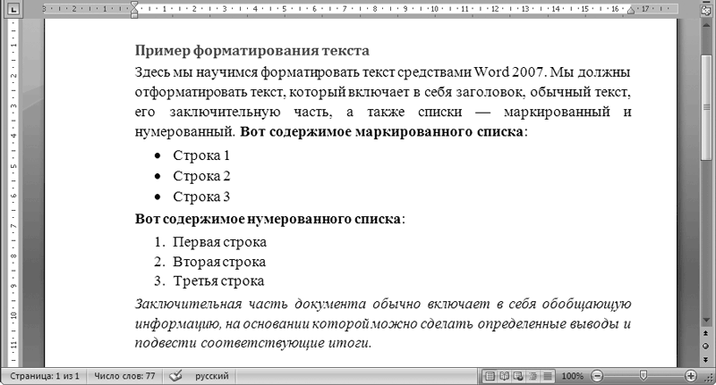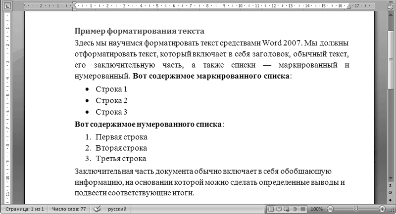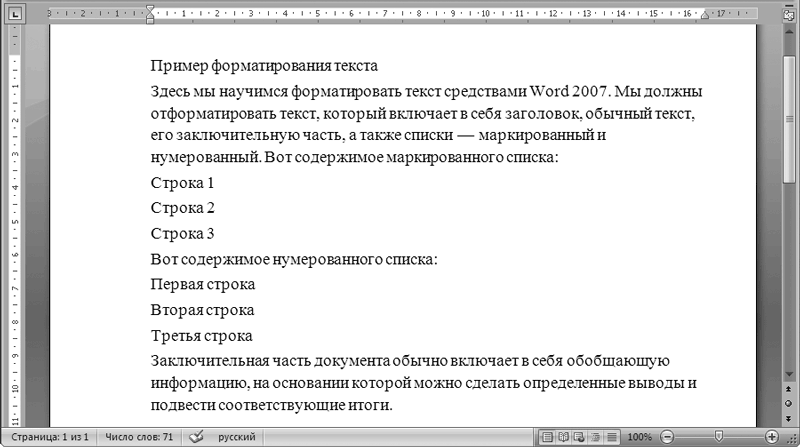 Форматирование текста – это процедура, без которой не обходится практически ни один документ: всегда нужно как-то оформить заголовок, создать список, выделить стилем текстовый фрагмент или слово и т. д. В данном разделе мы на конкретном примере научимся выполнять форматирование текста в редакторе Word 2007.