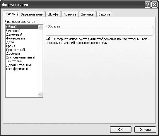 На вкладке Число выбирают подходящий числовой формат ячейки (диапазона), а также настраивают параметры выбранного формата. Пример того, как будет выглядеть содержимое ячейки (диапазона) при текущих настройках, вы можете увидеть в поле Образец.