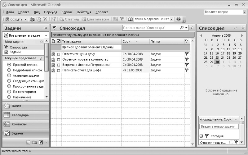 Возможности программы Microsoft Outlook 2007 предусматривают ввод, редактирование и хранение информации о любых стоящих перед вами задачах (делах, действиях и т. д.). Они могут быть связаны как с выполнением служебных обязанностей (например, «Провести переговоры», «Организовать совещание» и т. д.), так и с личными, бытовыми, семейными и иными делами («Отвезти тещу на дачу», «Заехать в автосервис» и т. д.).