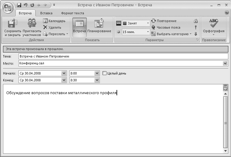 Для ввода информации о новой встрече необходимо выполнить команды главного меню Файл– > Создать– > Встреча и Действия– > Создать встречу либо нажать комбинацию клавиш Ctrl+N. Чтобы перейти в режим редактирования информации о введенной ранее встрече, дважды щелкните на ней кнопкой мыши или выберите пункт Открыть контекстного меню. При выполнении любого из перечисленных действий открывается окно ввода и редактирования встречи, изображенное на рис. 5.13.